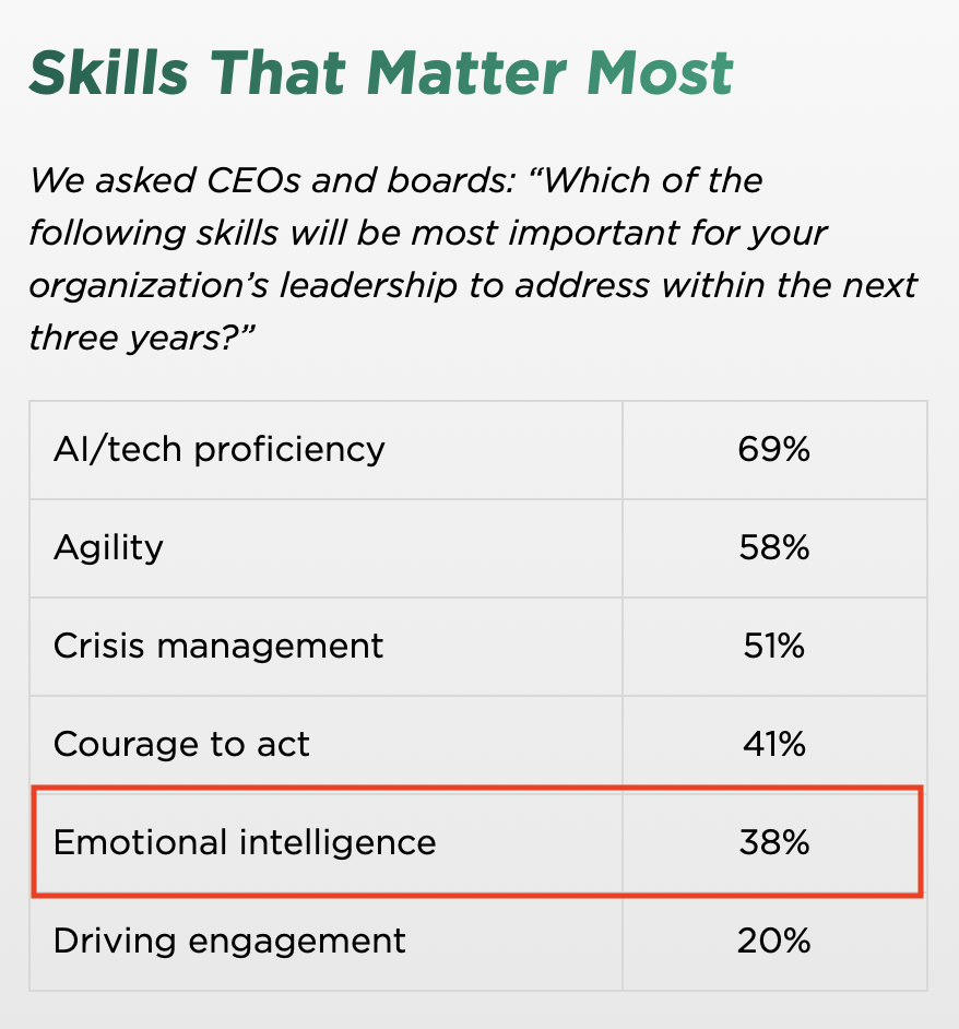 - Yet only 38% of CEOs show strong emotional intelligence, and only 20% are seen as capable of driving engagement (Korn Ferry, 2025).