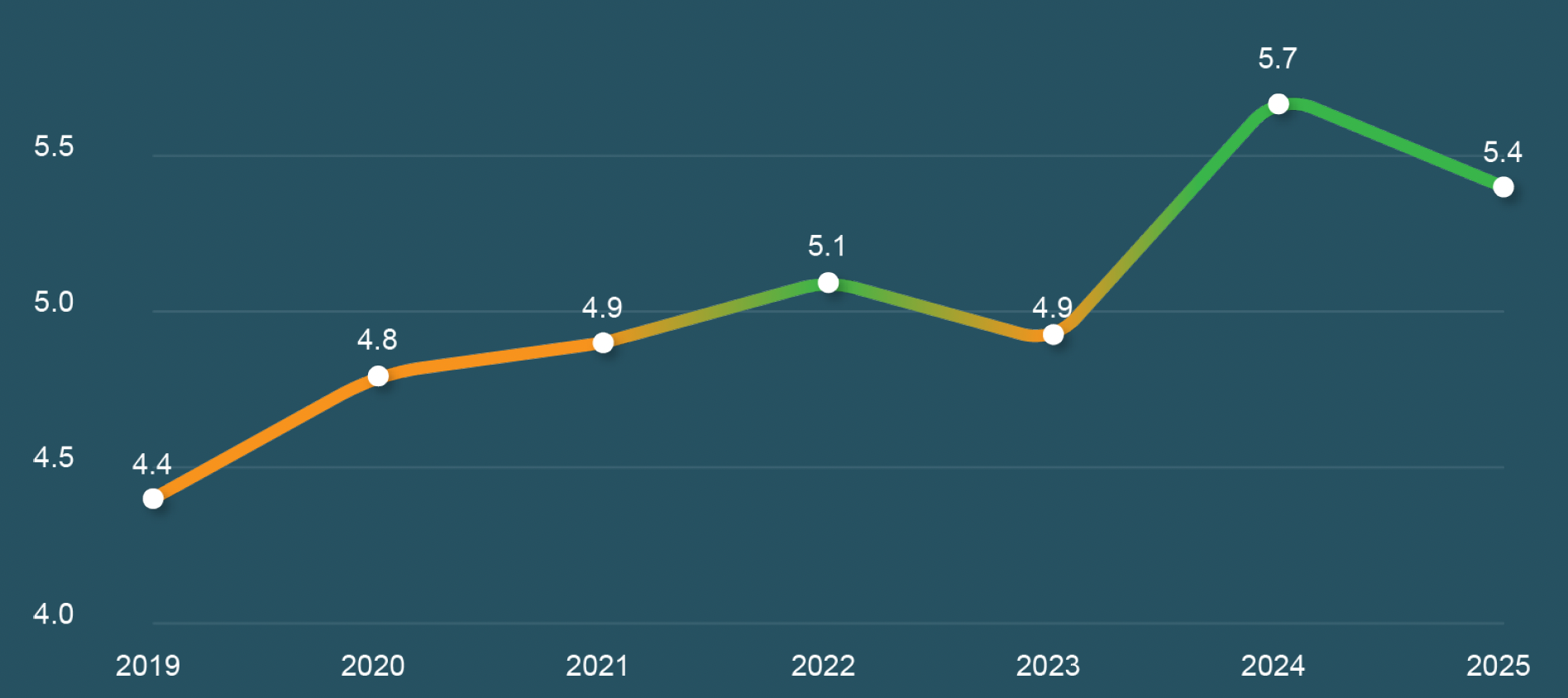 On paper, Business Agility is holding up. The 2025 report shows a global average Business Agility score of 5.4. That number is significant. It reveals a simple truth: many organisations have gained real capability over time. Agility has not disappeared.