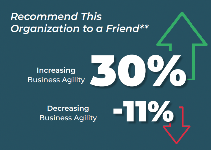 - Using Glassdoor ratings as a guide, companies with better Agility have happier employees. The Recommend to a Friend score is up 30% for agile firms, while it’s down 11% for those losing Agility. Glassdoor scores also reflect this: up 8.8% for agile companies and down 7.5% for others.