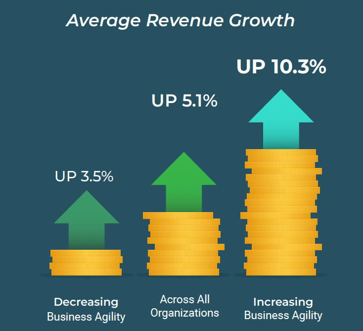 - Organisations that improved their Business Agility saw higher revenue growth in 2025. Those with increasing Agility had lifts of +5.1% and +10.3%, while those with decreasing Agility grew by +3.5% on average.